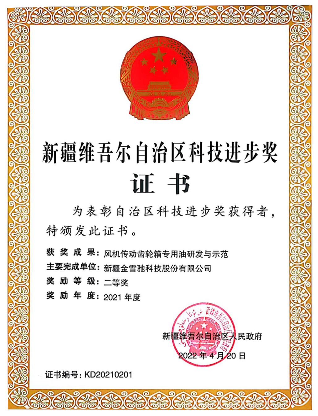 2022年新疆金雪馳科技股份有限公司榮獲“新疆維吾爾自治區2021年度科技進步二等獎”。