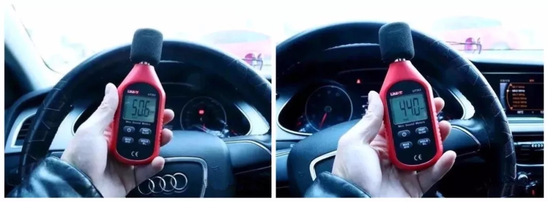 車輛怠速情況下, 更換前車內(nèi)噪音值為50.6分貝(左圖),更換后為44分貝(右圖),靜音效果顯著,這就相對于,前一秒您的車子里還有一臺洗衣機在工作,使用金1號后,車內(nèi)有個人在跟您輕聲聊天。