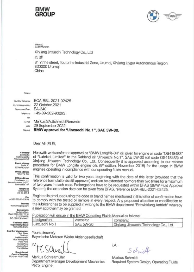 Jin Xuechi No. 1 5W-30 gained the BMW Longlife-04 standard certification On September 29th , 2022. This marks that Jinxuezhi GOLD No.1 5W-30 has once again been recognized by the world's authoritative automobile manufacturers.