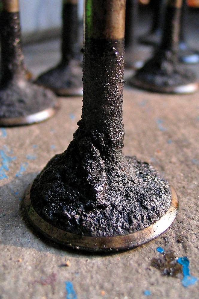 氣門部位的積炭主要是殘留燃油中的不飽和烯烴發生氧化反應,和一些無法完全燃燒的炭氫化合物、石蠟、膠質等雜質在高溫下逐漸轉化成的一種焦黑色物質,這種物質如沒有立即被清除,則會吸附燃油而進一步累積積聚,此部位產生積炭與汽車的燃料供給方式有很大的關系,類似的是進氣管積炭的產生,主要是由于一些殘留未燃燒的燃油不斷蒸發氧化產生的一些膠狀物在高溫下逐漸硬化所致。氣門和進氣管積炭嚴重時,可導致汽車怠速不穩、提速乏力、冷啟動困難等。